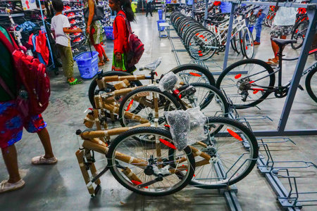 ULUBERIA, HOWRAH, WEST BENGAL / INDIA - 18TH MARCH 2018 : Sports cycles are on display at Dechathlon S.A. - world's largest sporting goods retailer. Clerance sale - editorial stock image.
