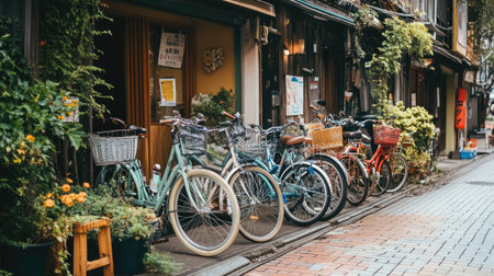 A picturesque alley featuring an array of vintage bicycles parked outside a charming caf