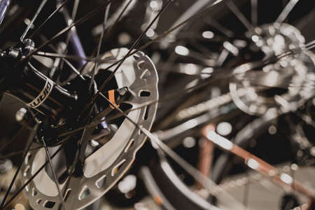 Bicycle rental for entertainment and outdoor recreation. Bicycles for cross-country trips. Bicycle parts close-up. Soft focus. Weekend in nature for the whole family.