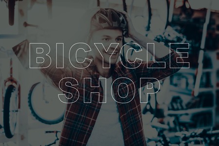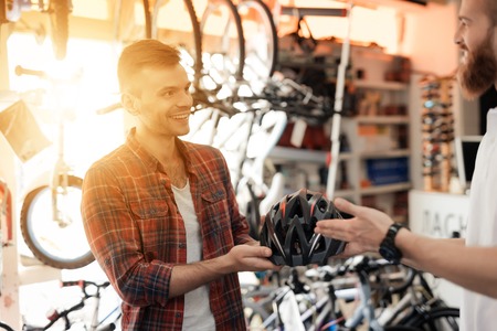 Bicycle Shop. Customer Choosing the Helmet on His Bike. Buyer Wearing a Helmet. Customer Measures a Bicycle Helmet. Man are Happy and Smiling. Different Bikes on Background of Man.