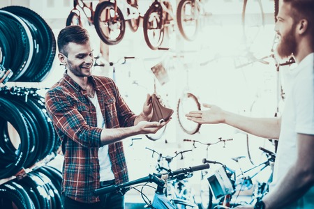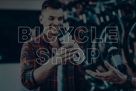 Bicycle Shop. Salesman Showing the Water Bottle to Customer. Water Bottle for Bicycle. Customer Choosing the Water Bottle on His Bike. Customer Happy and Smiling. Different Bikes on Background of Men.