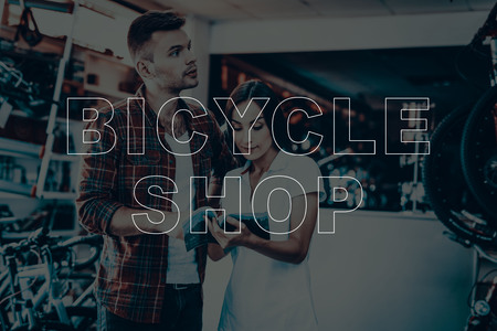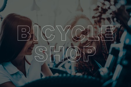 Bicycle Shop. Salesman Showing Bicycle to Customer. Man Looking on the Bike. Man and Woman Sitting. Customer Choosing the Bike. Different Bicycles in Shop. Woman Sales the Bicycles. Closeup.