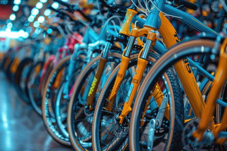 A colorful array of bicycles neatly arranged in a bike shop, showing a variety of styles and models to cater to different customer preferences.