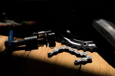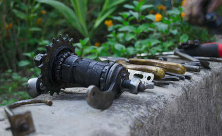 tools and parts for the repair of a bicycle in the workshop