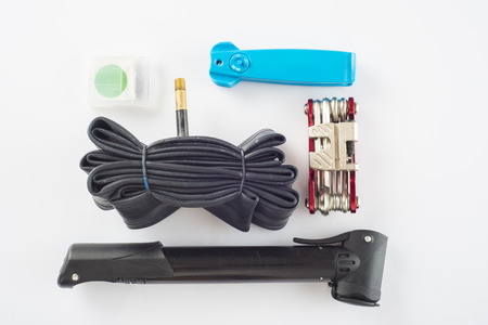 Tools set for cycling and to fix a flat tire isolated on a white background