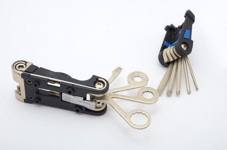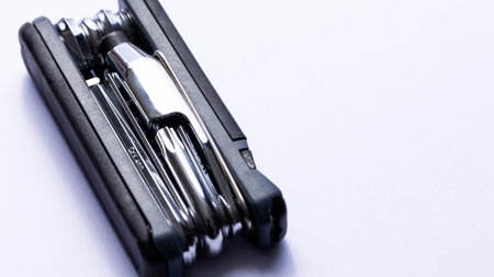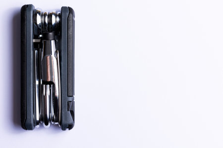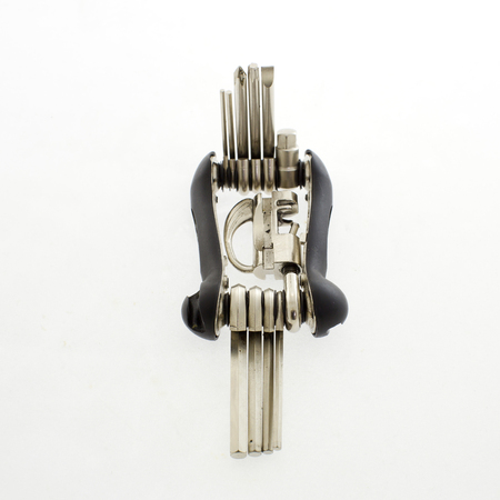 black multitool with screwdriver and hex wrenches for bicycle closeup