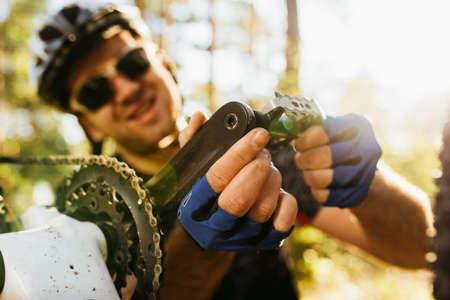 Close up shot of concentrated and smiling young rider in helmet, glasses and gloves sitting in front of his bicycle, repair pedal bike before cycling workout outdoors in forest. Cyclist repairing bike