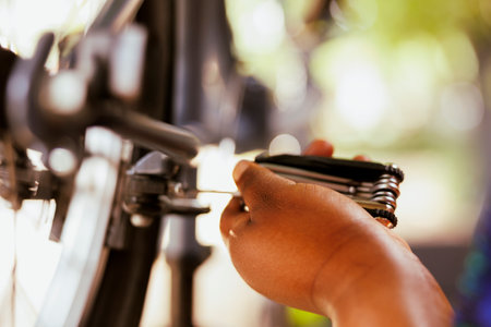 Image showcasing female hand using specialized equipment to adjust the valve on bike wheel. Detailed shot of african american person mending bicycle carefully using multipurpose tool.