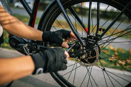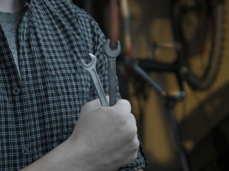 Cool classy young guy is fixing his bicycle with wrenches before taking a ride