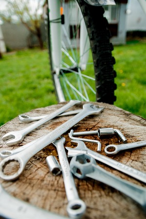 Bicycle repair. Tools, instrument for repairing bike on the wooden stump background near spokes of a wheel