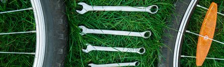 Banner of Tools, instrument for repairing bike on the grass outdoor near bicycle wheels. Bicycle repair.