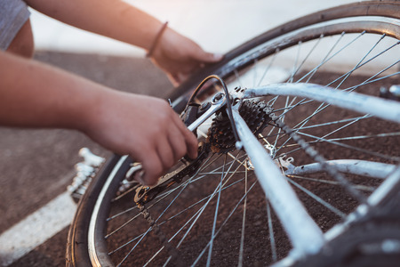 Teenager boy repair tire on bicycle summer outdoor photo, close up
