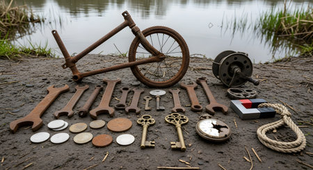 A fascinating collection of old and rusty items recovered from the water are neatly displayed on a muddy riverbank. The treasures, found through the hobby of magnet fishing, include a bicycle frame, antique keys, old coins, and various tools.