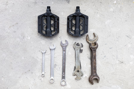 Set of old tools for bike repairing on gray background. top view. copyspace.