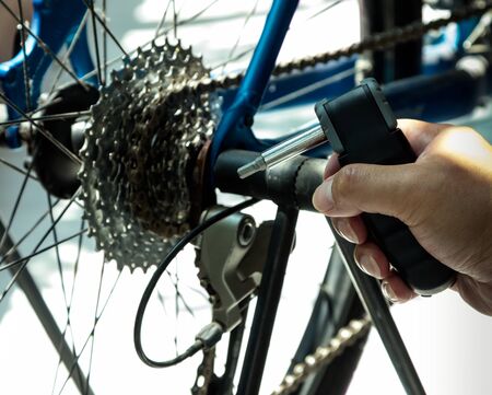 hand with bicycle shop tool, maintenance and repairs