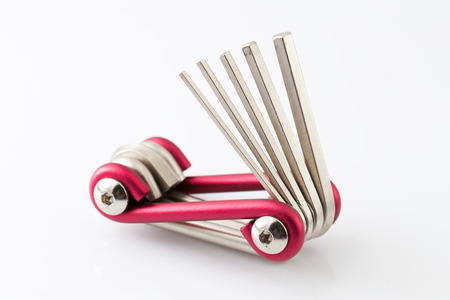 A set of hex keys hanging on one ring on a white background.