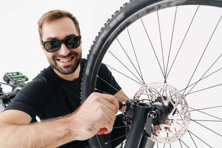 Happy young rider man smiling while repairing his bicycle isolated over white background