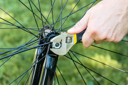 Bicycle master repairing a bicycle wheel with a tool on the street during a walk. Urgent bike repair.