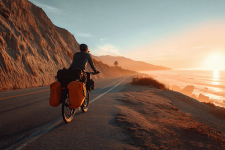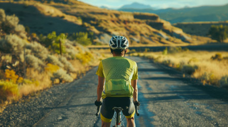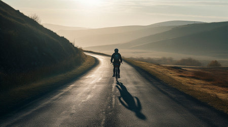 A cyclist rides along a winding road, amidst lush green hills under the soft glow of the setting sun. The scene evokes a sense of freedom, adventure, and the beauty of the natural landscape. Perfect for illustrating travel, outdoor activities, and active lifestyles.