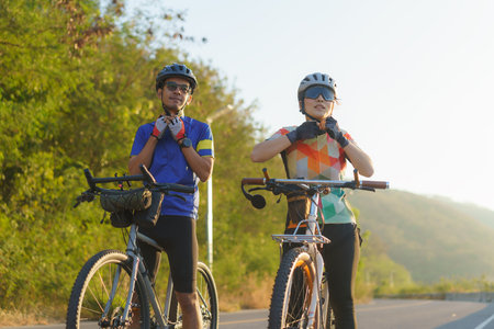 Asian cyclist couple dons helmets and chin straps as they prepare for their bike ride around a beautiful morning lake.