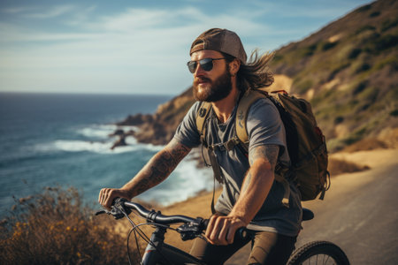 Handsome bearded man with a backpack on his back riding a mountain bike along a road along the ocean.
