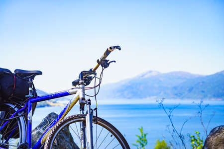 Bike with active equipment at norway mountains scene. Bicycle On Mountain. Bicycle Parked On road Against Mountains. Bicycle tourism in norwegian mountains, scandinavia and europe active life.