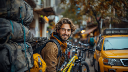 Smiling male cyclist unloading his bike in a bustling city street, surrounded by vehicles and vibrant urban life. Adventure, travel, and exploration are captured in this lively scene.