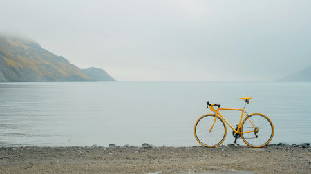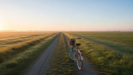A bicycle rests on a dirt path, flanked by vast fields, illuminated by the soft light of dawn. The image showcases a landscape with a clear sky and a gentle gradient of colors. This scene offers visual appeal suitable for various uses, including marketing and editorial purposes.