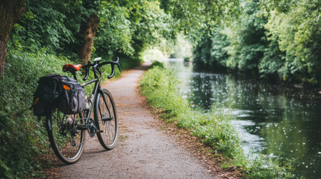 A tranquil bike path along a serene waterway surrounded by lush greenery. Ideal for outdoor enthusiasts seeking adventure and relaxation in nature.