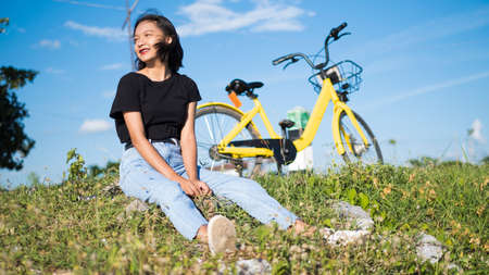Happy young asian girl with yellow bicycle at park .