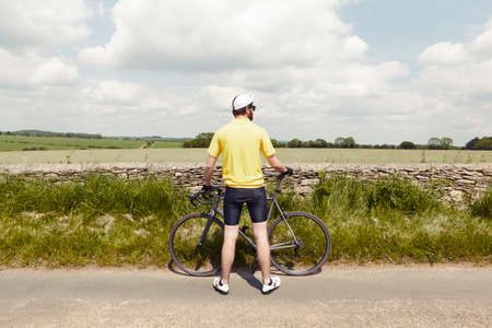 Cyclist standing by stone wall, Cotswolds, UK
