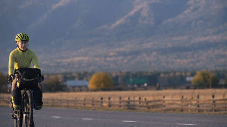 The woman travel on mixed terrain cycle touring with bikepacking. The traveler journey with bicycle bags. Sport tourism bikepacking, bike, sportswear in green black colors. Mountain snow capped.