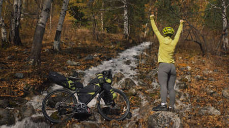 The woman travel on mixed terrain cycle touring with bikepacking. The traveler journey with bicycle bags. Sportswear in green black colors. The trip in magical autumn forest, river stream.