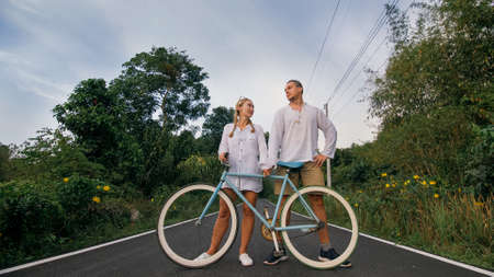 Biking road trip. Love couple on blue bike in white clothes on forest road. Just married woman and man kiss, hugs, stand on bicycle. Wedding, honeymoon. Cycling Cycle Fix. Asia Thailand ride tourism.