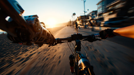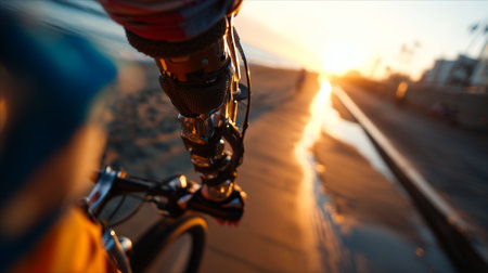 Person with a prosthetic arms enjoying a scenic bike ride on a beach path at sunset.