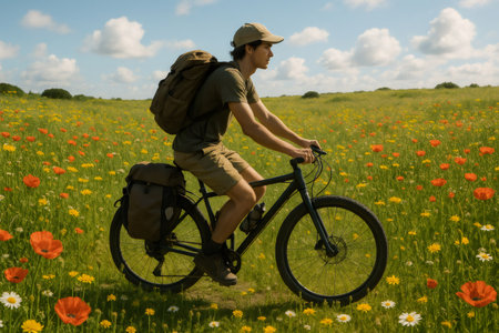 Man rides a bicycle through a colorful meadow filled with wildflowers, under a clear blue sky, embodying adventure and freedom in nature