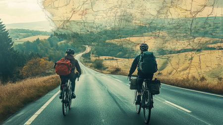 Two cyclists ride along a winding road surrounded by lush nature, exploring the scenic countryside while consulting a map for their bike tour route.