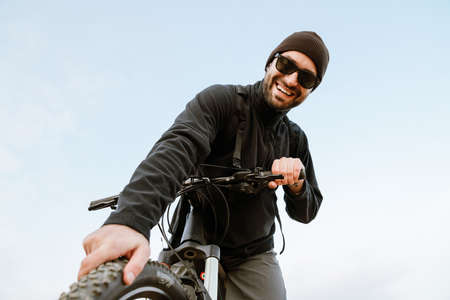 Portrait of a happy young man riding his bicycle in the countryside