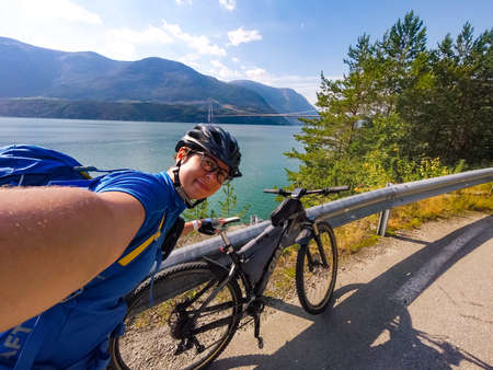 Theme of mountain biking in Scandinavia. human tourist in helmet and sportswear on bicycle in Norway on Hardanger Bridge suspension bridge thrown across the Hardanger Fjord in southwestern Norway.