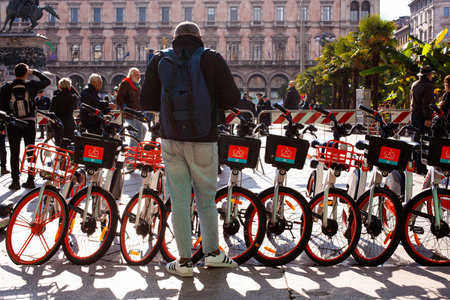 Milan, Italy - November, 04: Rearview of a man wearing a backpack next to a row of share bikes of Ridemovi company on November 04, 2021