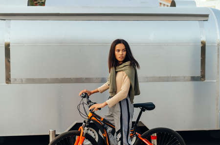 Stylish latin woman in casual clothes stands on a bicycle on a background of a silver wall and looks to the side with a serious face. Woman on a bicycle walks down a city street.