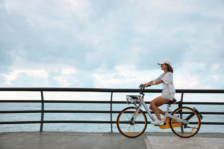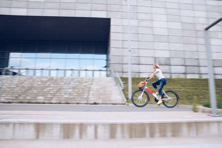 Pretty young woman with modern city bike. Clean sustainable urban transportation.