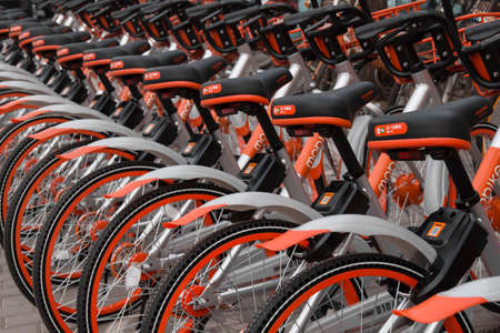 Closeup a lot of bicycles seats, group parking for rental., Taipei, Taiwan.