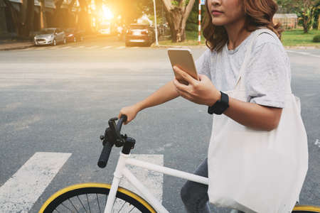Close up of a woman with a helmet riding a bike and checking the navigation map on her smartphone