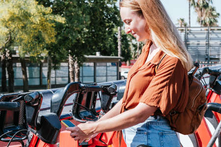 Renting bike using rental app on smartphone. Using bike sharing city service. Paid rent of electric scooter. Using mobile phone to rent and pay for public eco transport. Bike sharing city station. Ecological transport alternative. 24/7 rental mobile service