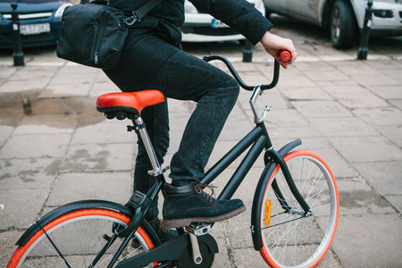 A person or a tourist rented a bicycle in the winter in street service in Warsaw and is about to ride. Cycling or eco-friendly transport.