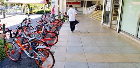 Singapore, Singapore- June 27, 2018: Many bicycle parked a lot for tourist and people for rent by using smart phone paying money for rent them near sky train station at Singapore, Singapore