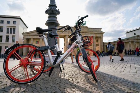 BERLIN, GERMANY - APRIL 28, 2019: Bicycles of the Chinese company Mobike in front of the Brandenburg Gate in Berlin