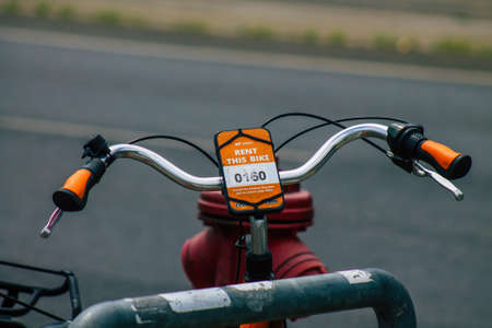 Limassol Cyprus March 13, 2020 View of bicycle to hire parked in the streets of Limassol in the afternoon