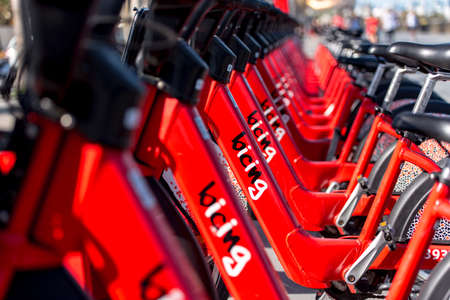 Bright red bicycles available for rent parked in a row. Concept of environmentally sustainable transport. Bike rental service Bicing. Barcelona, Spain, July 13th, 2020